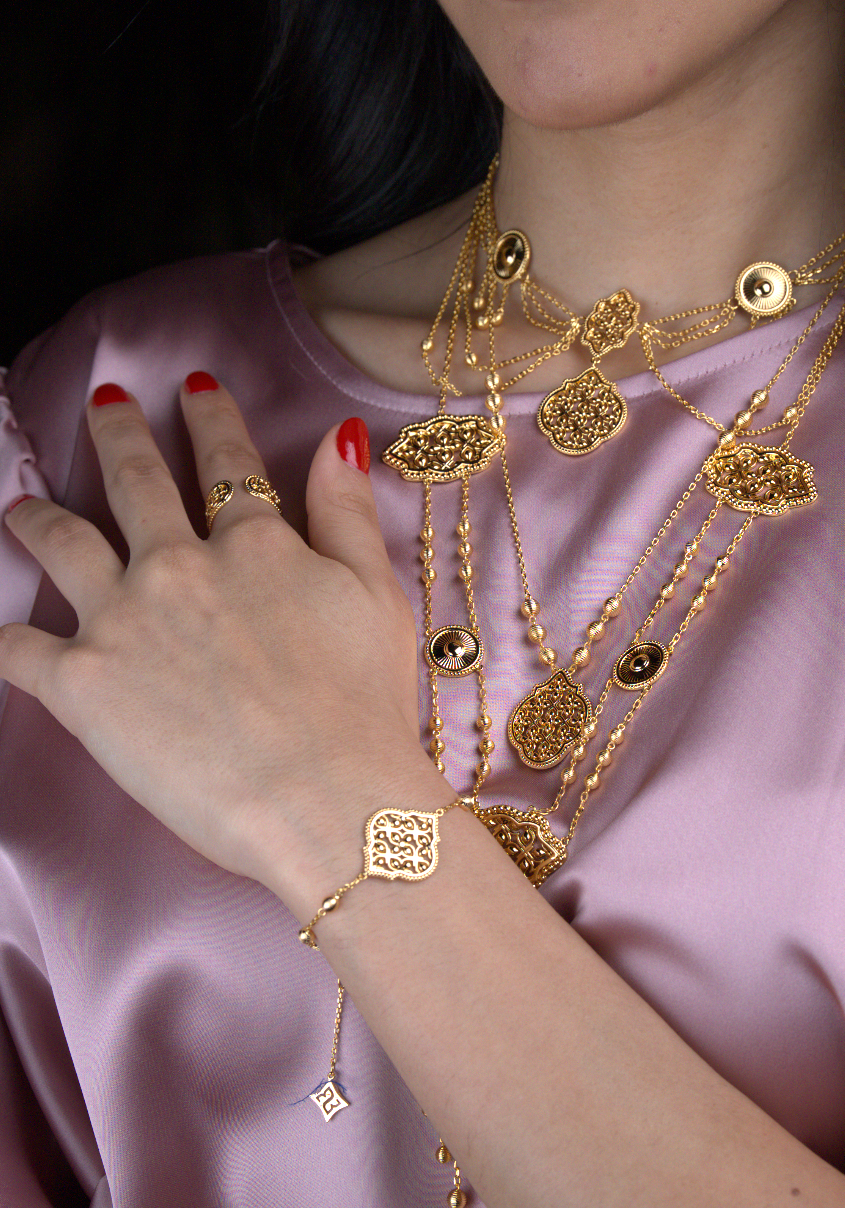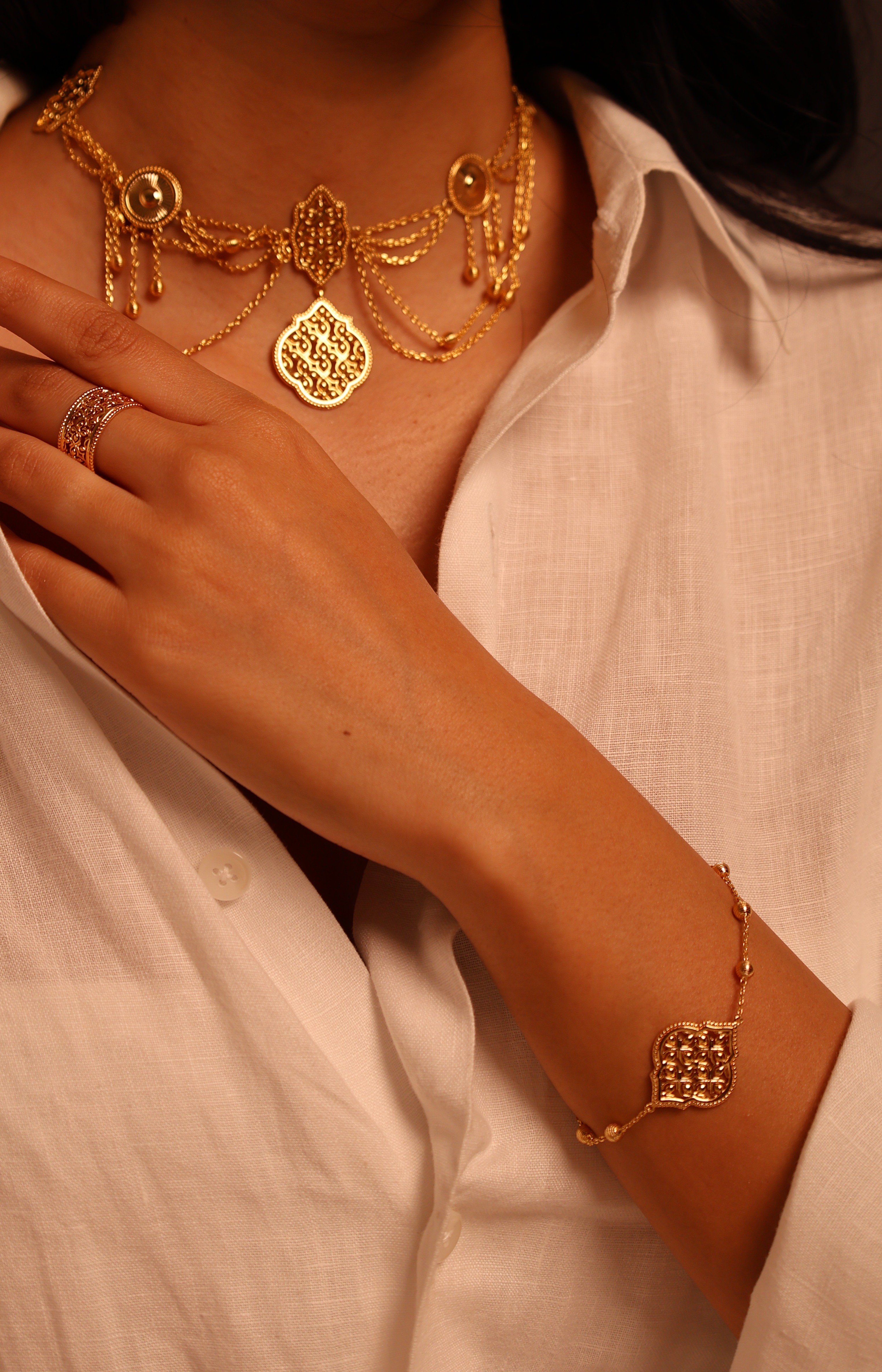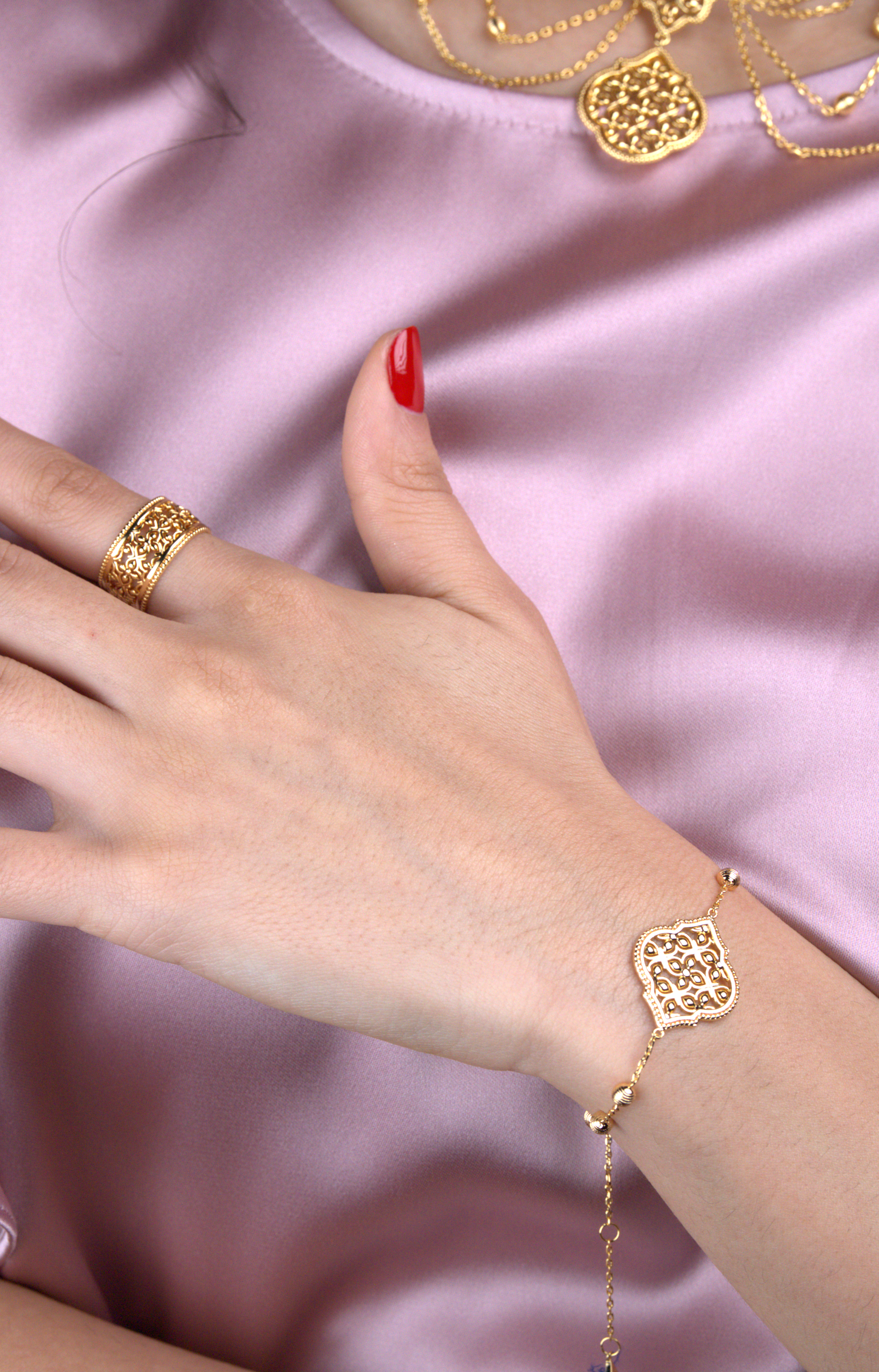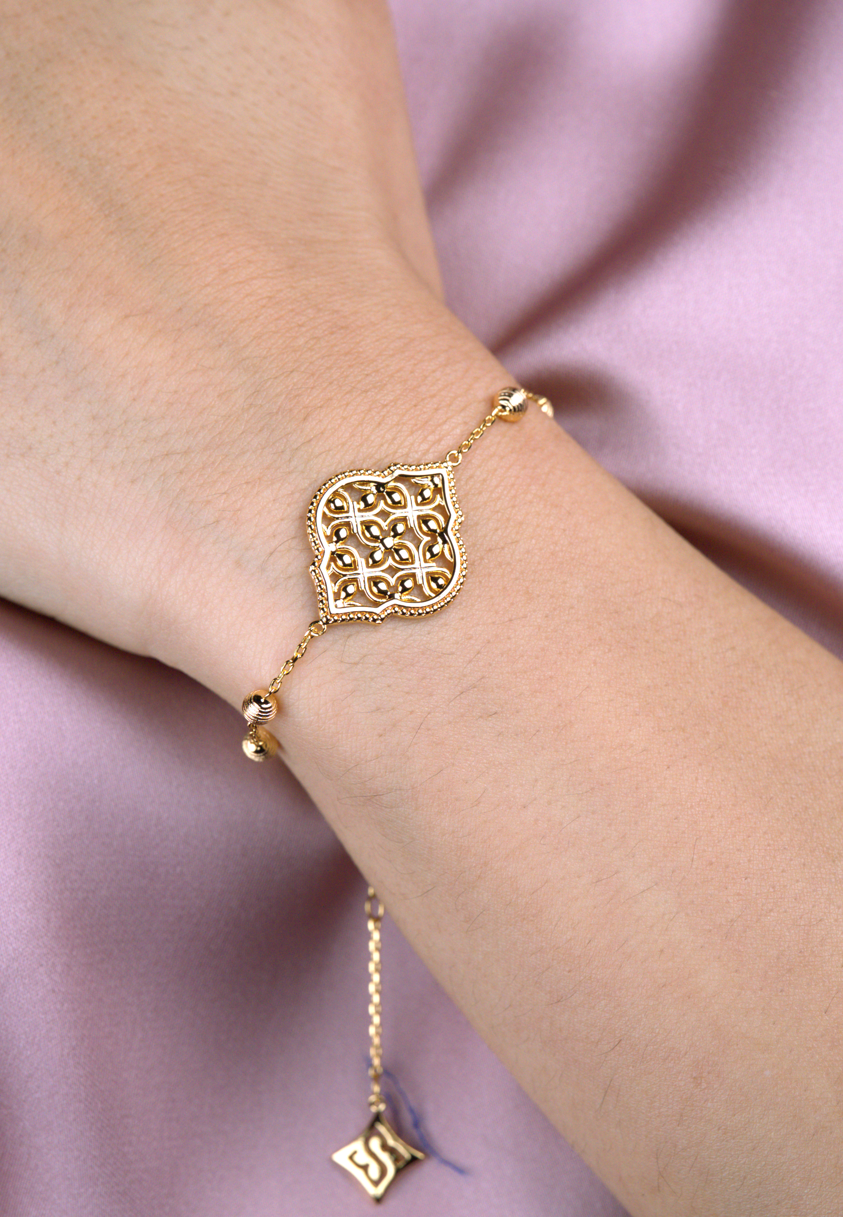 اندماج رائع بين التراث الإسلامي والأناقة العصرية، يتميز سوار ليالي بتصميم هندسي دقيق مستوحى من الزخارف العربية التقليدية. يضفي التصميم المفتوح لمسة من الإشراق، حيث يبرز الضوء تفاصيله المتقنة، مما يخلق لمعانًا ساحرًا مع كل حركة. يزينه كرات ذهبية مطلية تضيف لمسة فاخرة ورقيقة لمجموعتك من المجوهرات.