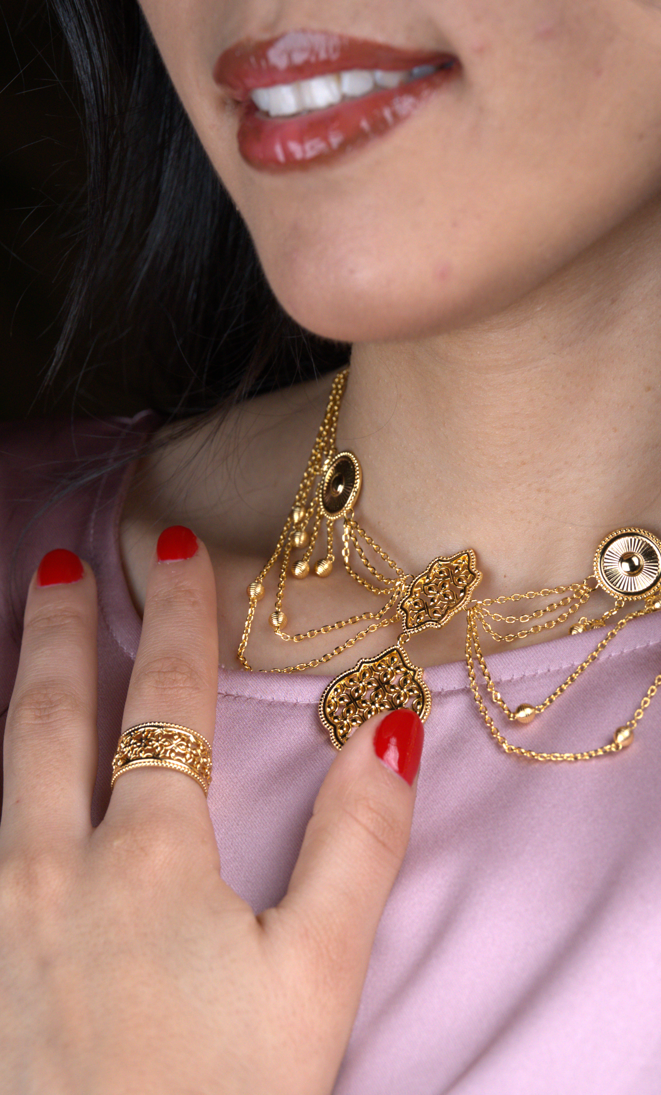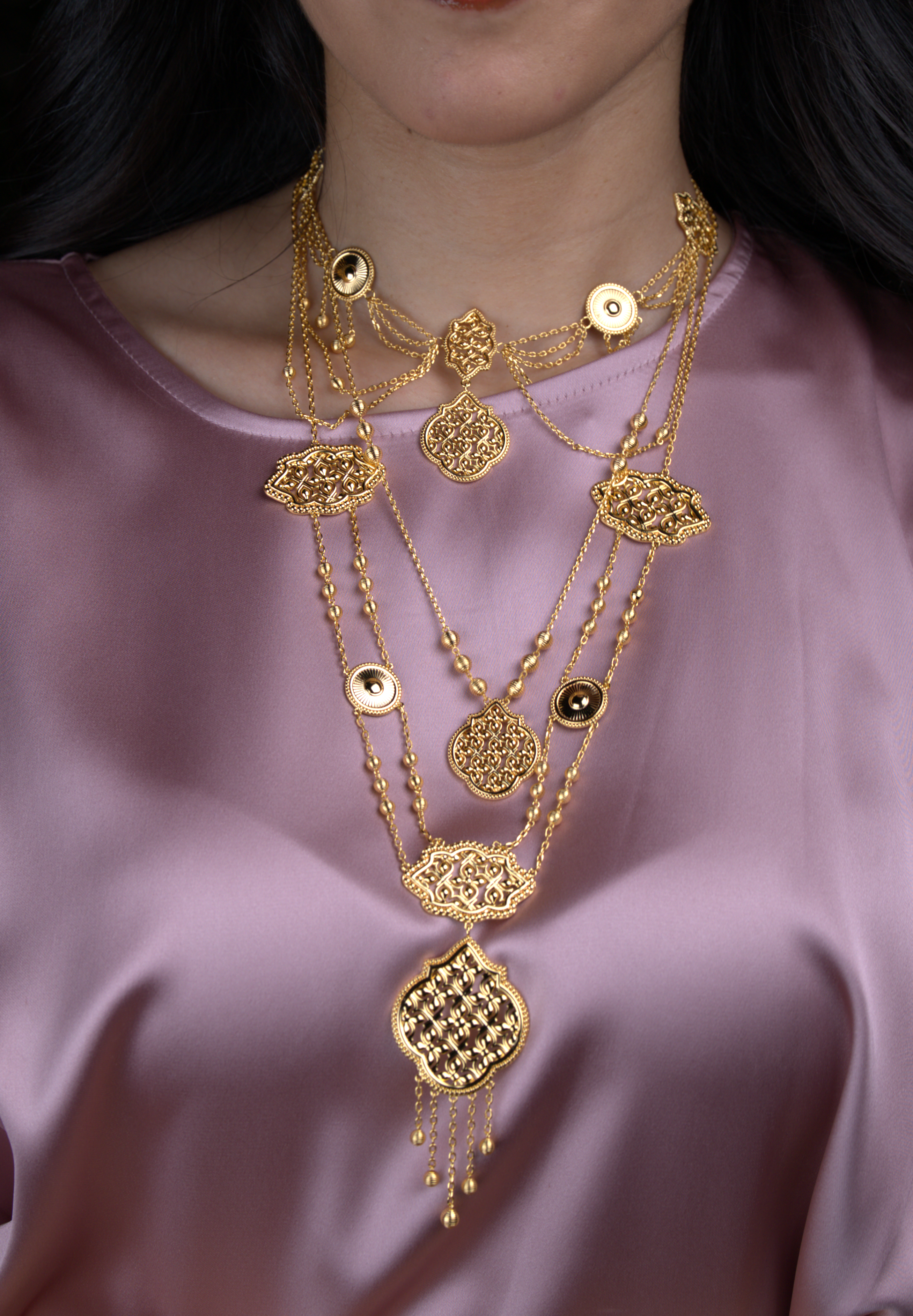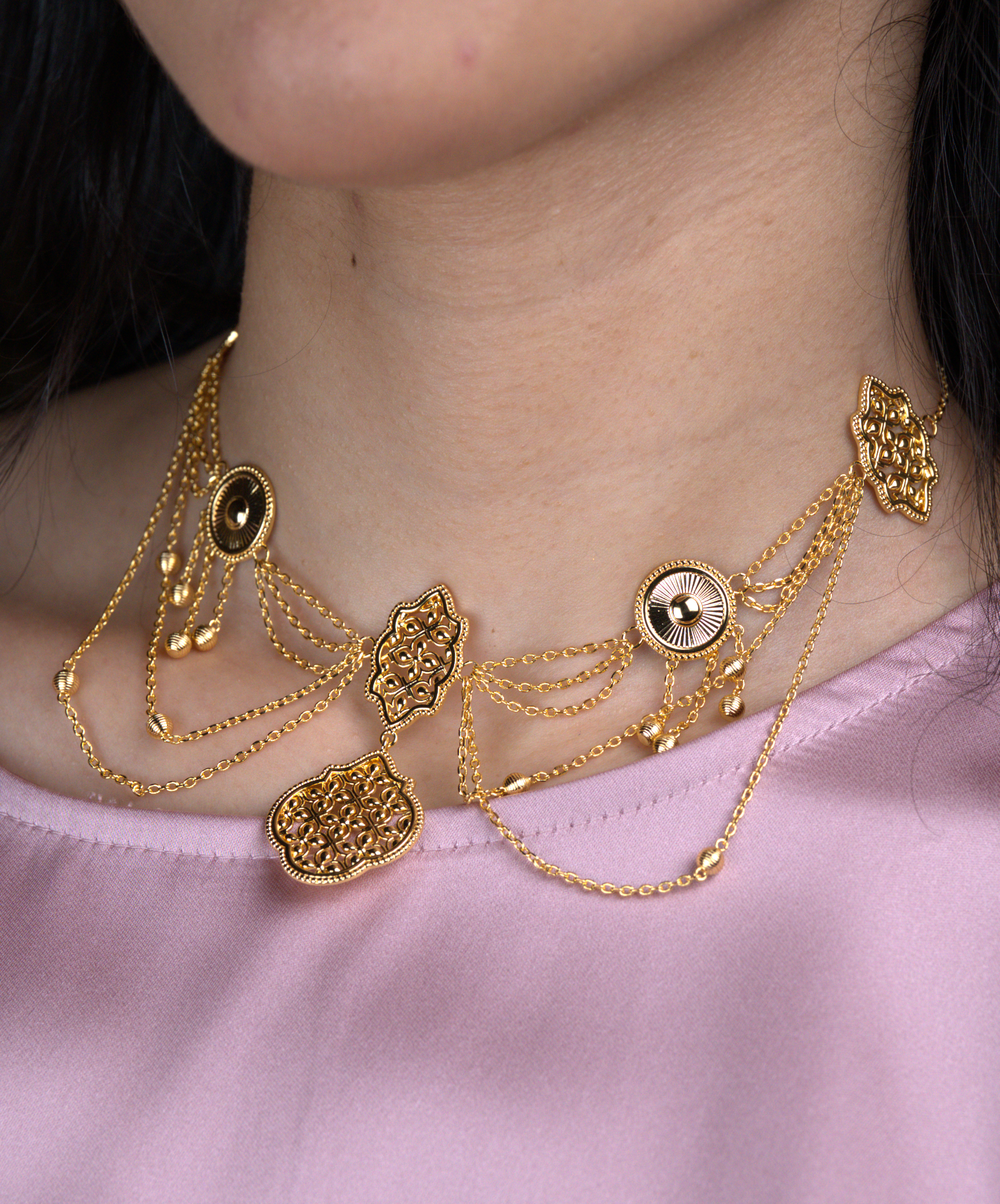 تحفة فنية مستوحاة من الزخارف الإسلامية، يجسد شوكر ليالي الأناقة والرقي. يتميز بتصميم متدرج يتألق بقلادة رئيسية مزخرفة بنقوش هندسية دقيقة، مع لمسات متدلية تضفي حركة ساحرة.
