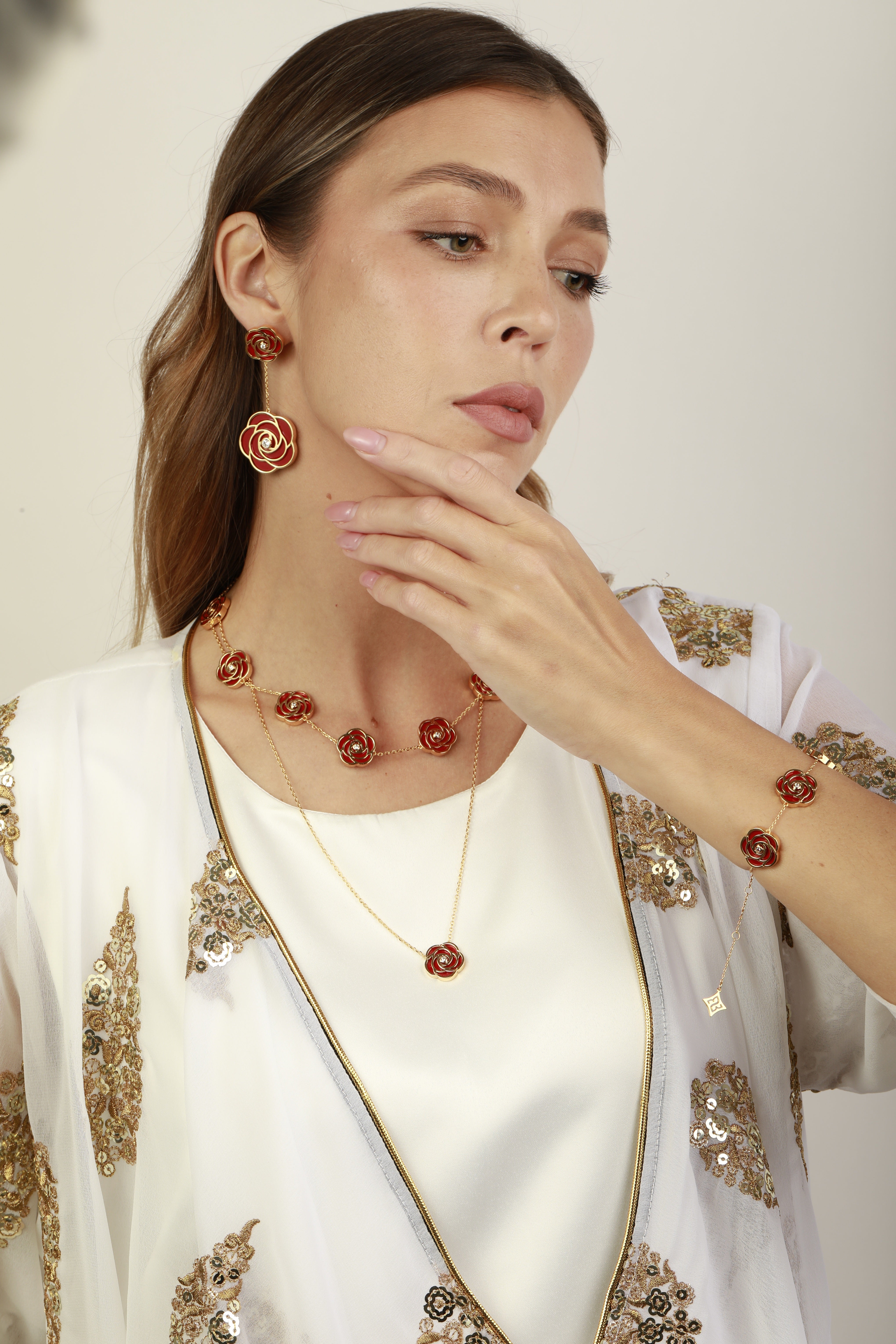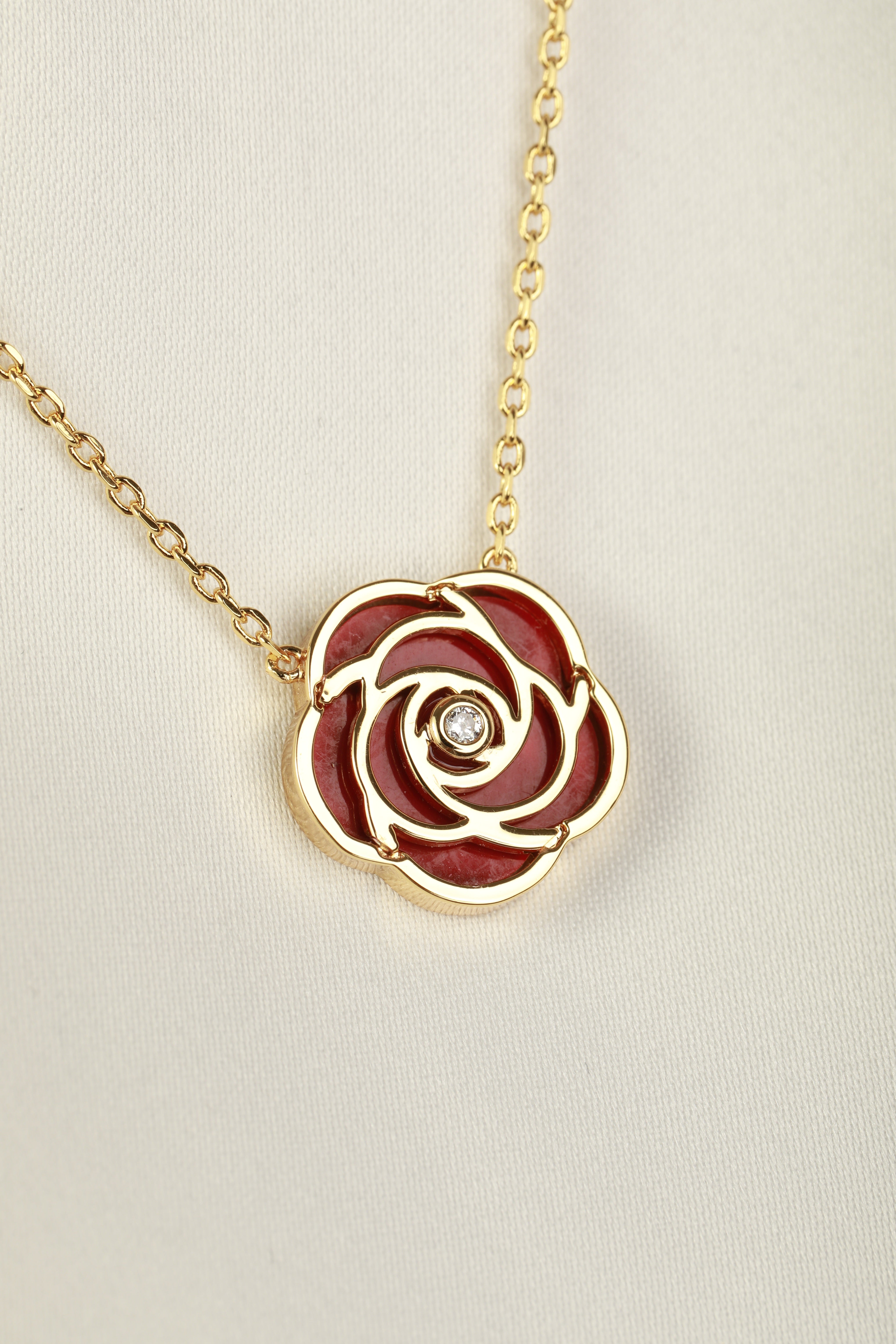 ترمز القلادة القصيرة من مجموعتنا "روز" إلى الأناقة والرقي، وهي مصممة لتعزيز أناقتك وتحسين مزاجك. تتميز هذه القطعة الرائعة بوردة مصنوعة بدقة في إطار مطلي بالذهب، مقترنة بحجر العقيق الأحمر . يناسب تمامًا مع خط رقبتك، فهو يكمل المظهر الرسمي والكاجوال، مما يجعله إضافة متعددة الاستخدامات لمجموعة مجوهراتك. تعتبر المجموعة رمز للأناقة الخالدة. اشعري بالقوة بجماله الفريد.