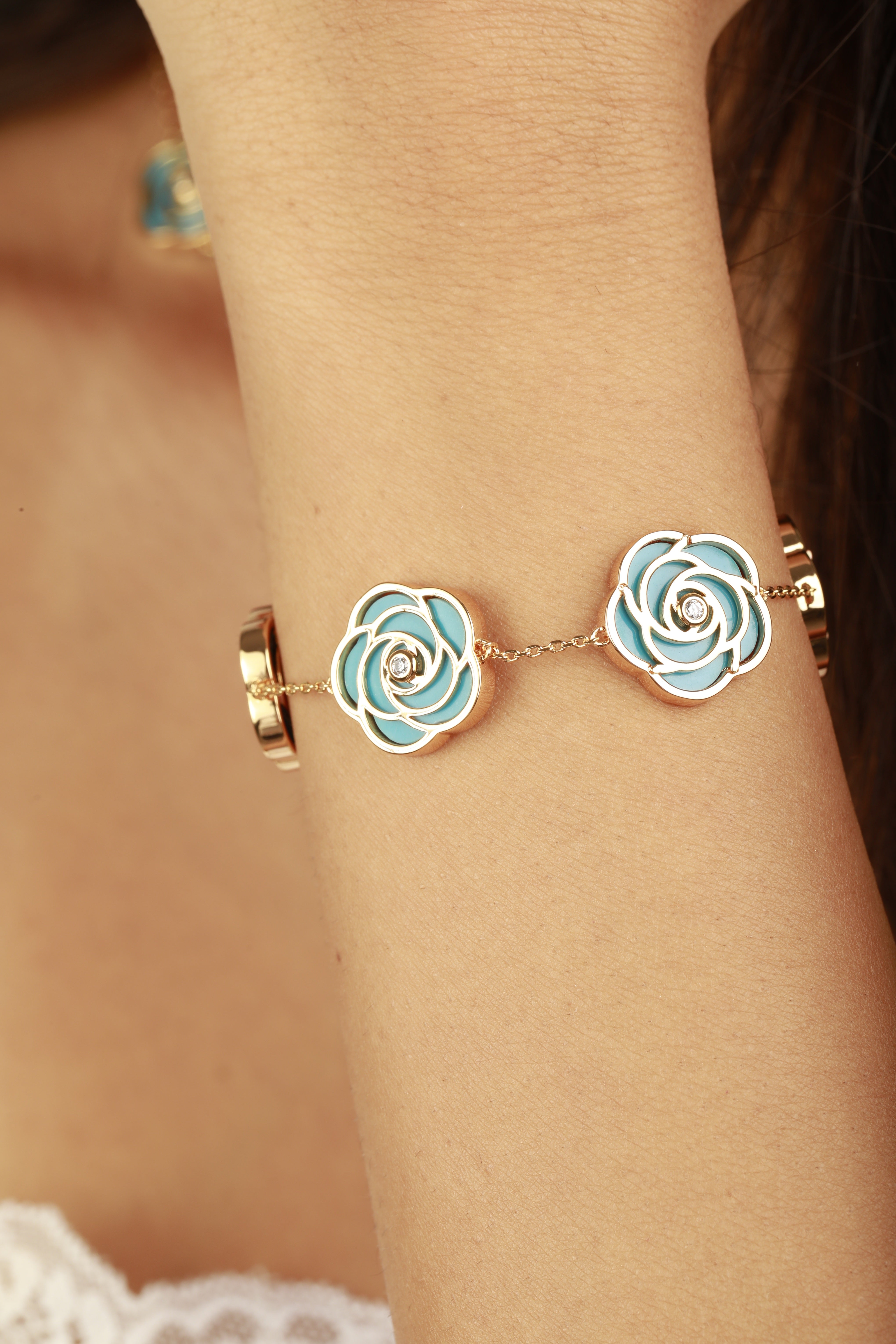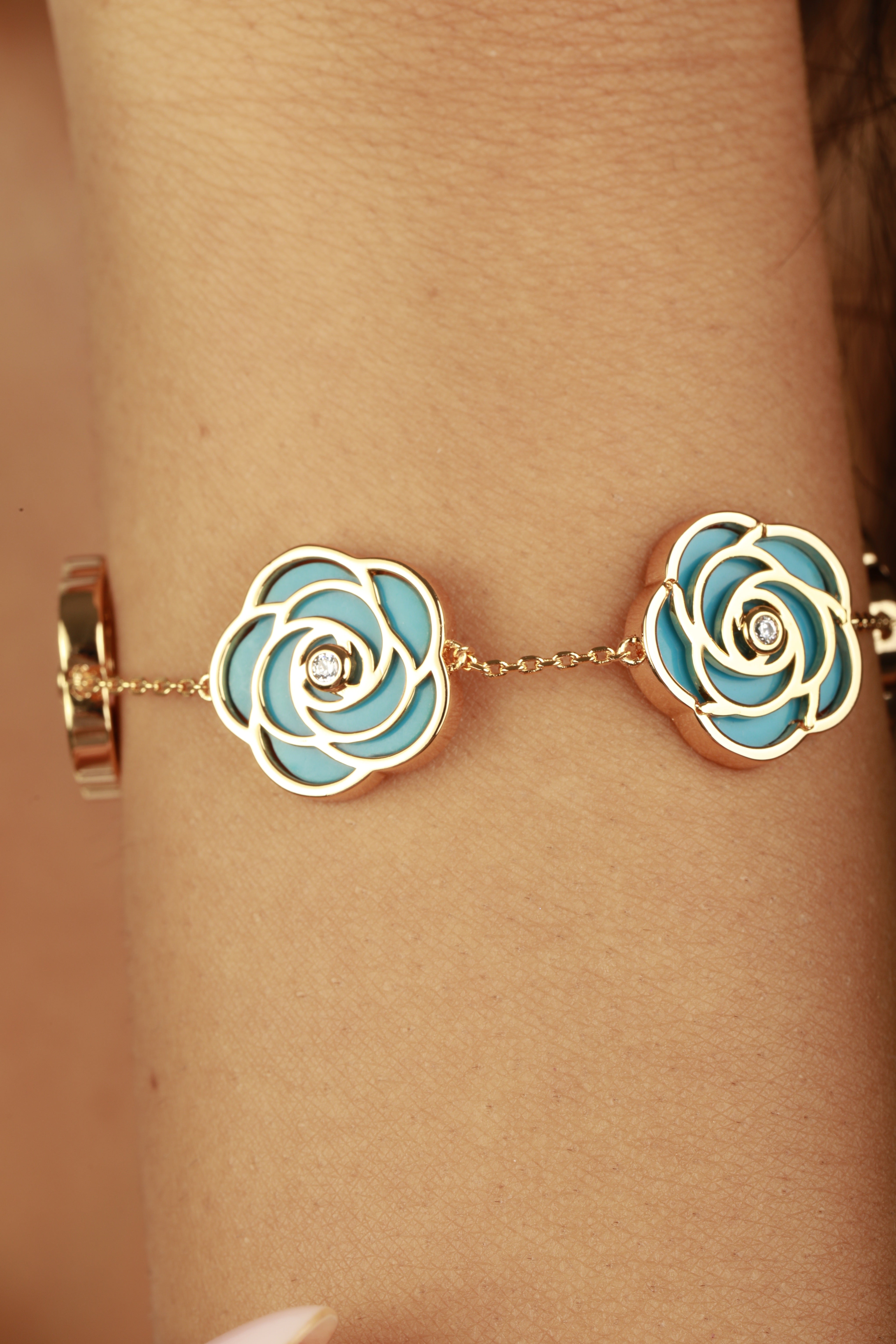 اكتشف السوار الأنيق من مجموعتنا روز، رمز الأناقة البسيطة. يتميز هذا السوار الرقيق بوردة واحدة مصنوعة بشكل جميل، موضوعة في إطار ذهبي لامع، تجسد مزيج المجموعة المميز بين الطبيعة والفخامة. تم تزيين الوردة بلمسة من عرق اللؤلؤ، مما يضيف تقزحًا رقيقًا يعزز سحرها. مثالي لإضافة لمسة من الرقي إلى أي ملابس، هذا السوار هو شهادة على جمال البساطة وإضافة متعددة الاستخدامات لمجموعة مجوهراتك.