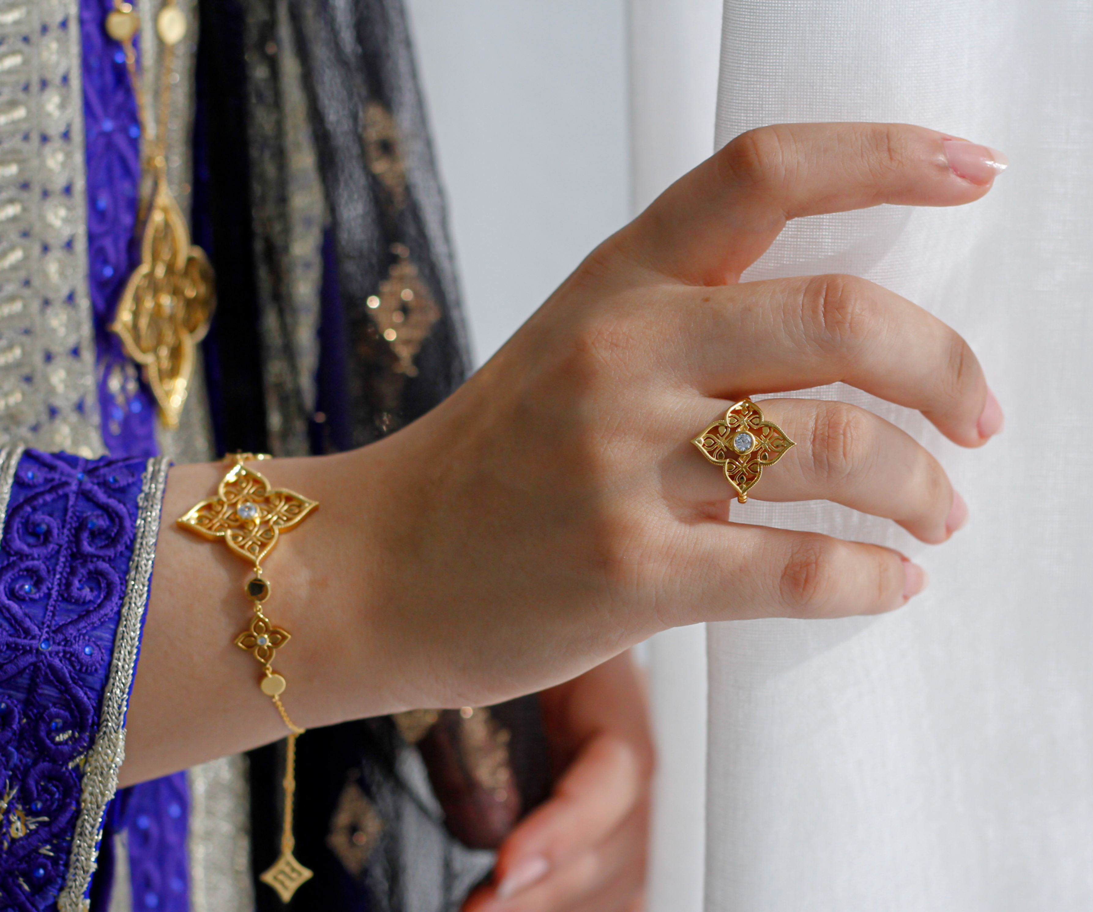 نقدم لكم خاتم "زينة" بقياس حر للأصابع مطلي بالذهب عيار 21 قيراطًا. مستوحى من الأنماط والعمارة الإسلامية الجميلة بلمسة فريدة من سولييل.