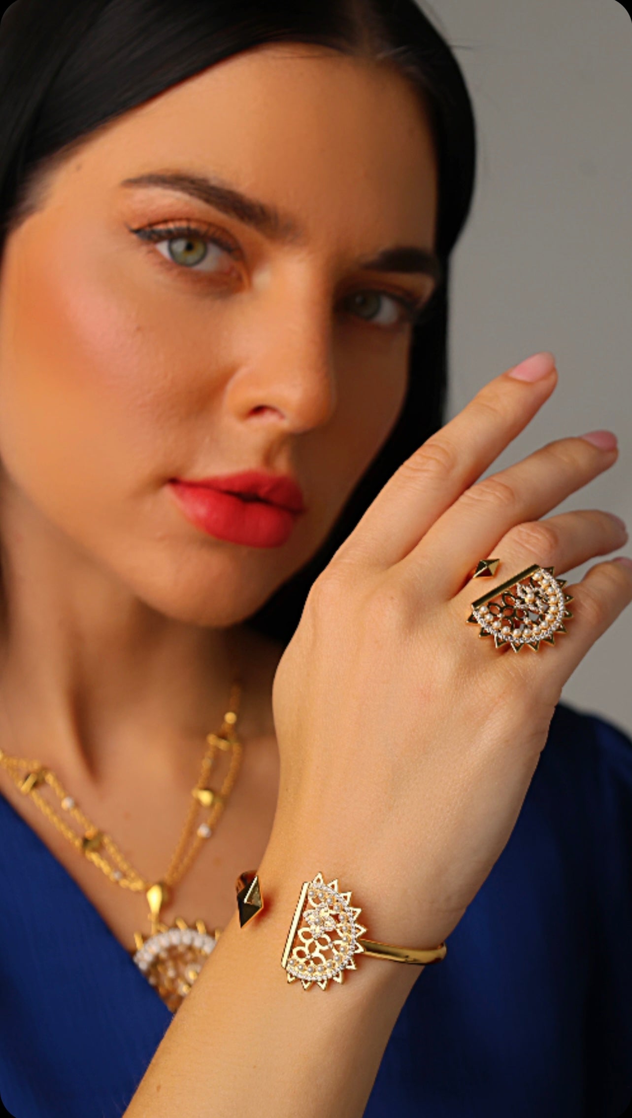 The Asayel cuff is perfect complement to your festive attire, whether you wear it in Ramadan, Eid, weddings, birthdays, or any special occasion. This elegant bracelet that captures the light perfectly.
