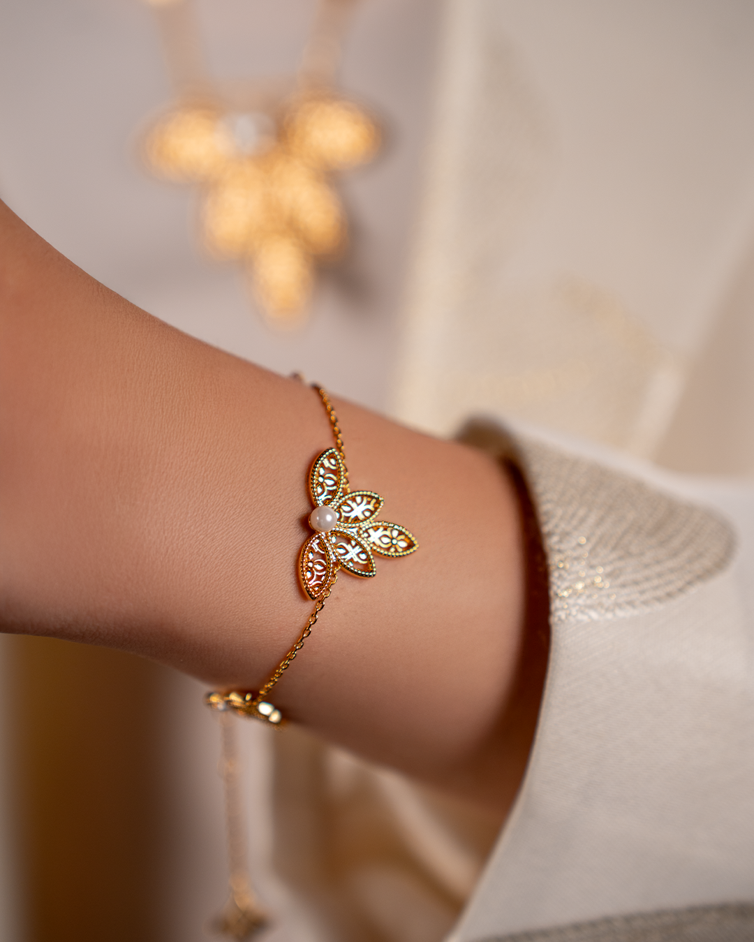 A delicate bracelet adorned with miniature floral motifs, offering a subtle yet luxurious shine. Designed to complement the necklace and choker, it adds a graceful shimmer to the wrist—perfect for stacking or wearing on its own.