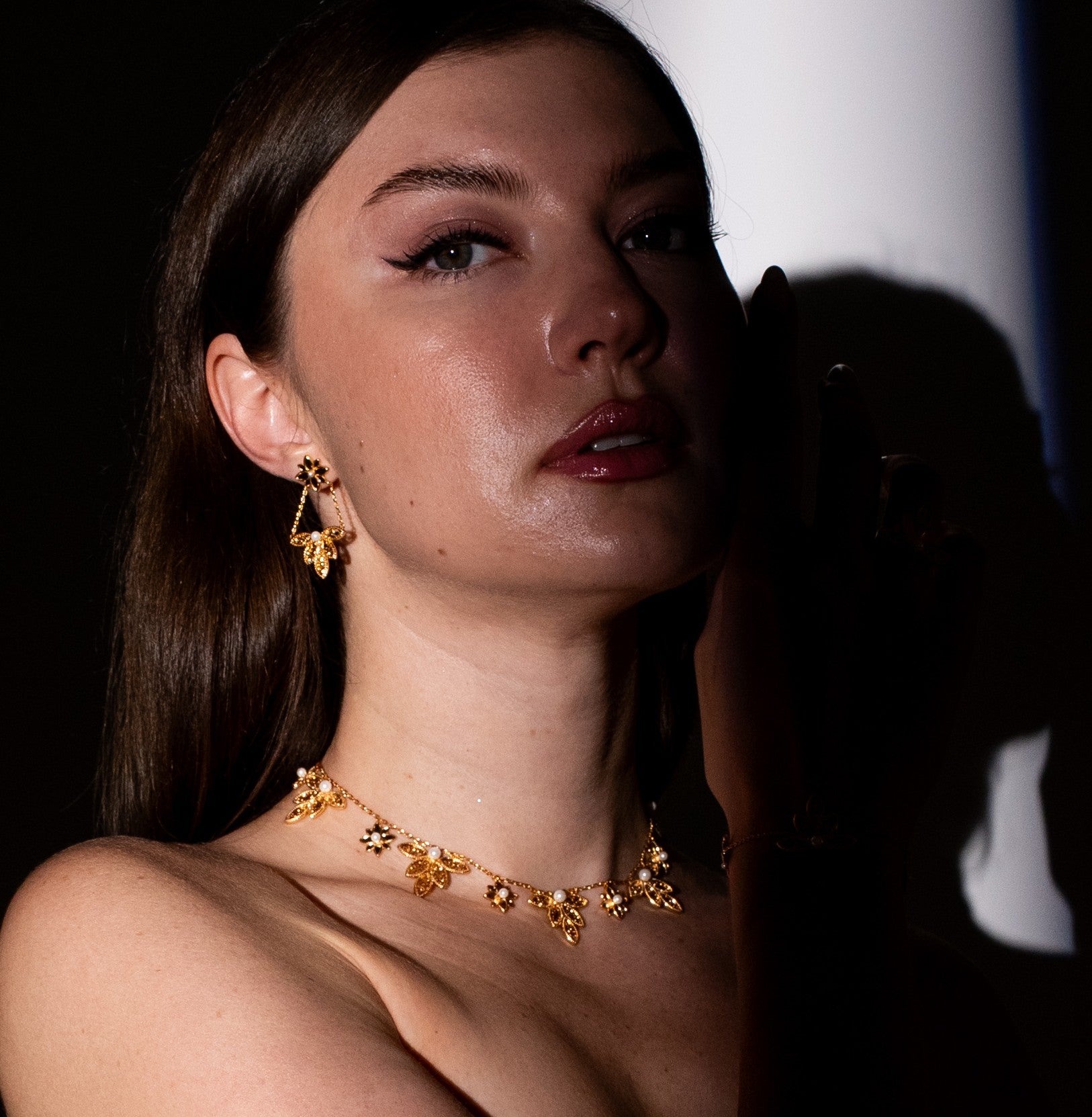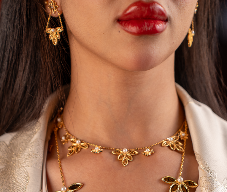 Bold yet delicately refined, the LAMIS Choker sits beautifully around the neckline, featuring a series of small floral elements linked together in perfect symmetry. Its detailed craftsmanship and golden glow make it the ideal piece for creating an elegant, layered look or wearing alone for subtle sophistication.