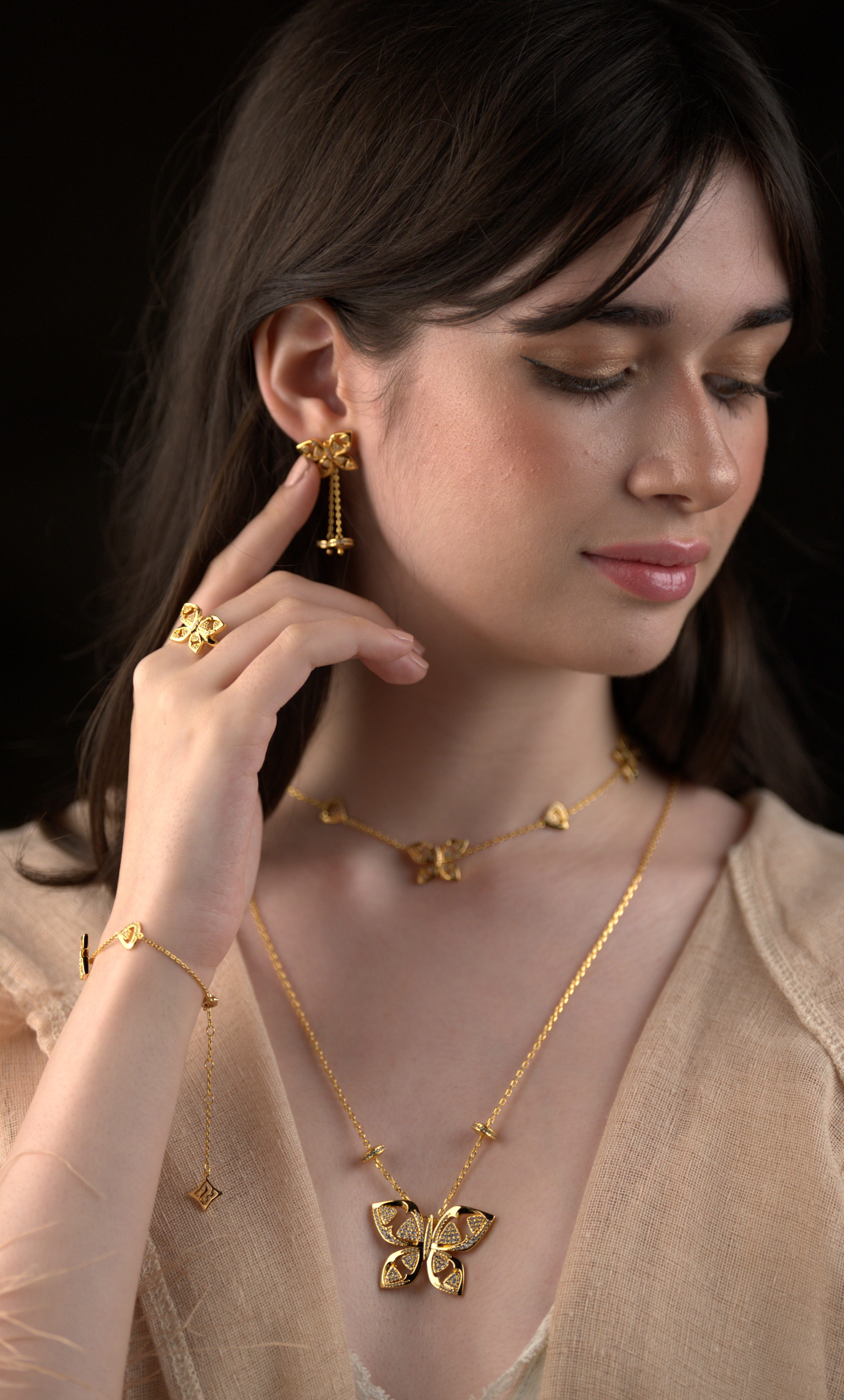 Plated with a thick layer of 21-karat gold over brass, featuring a meticulously crafted butterfly with dazzling zircon details.