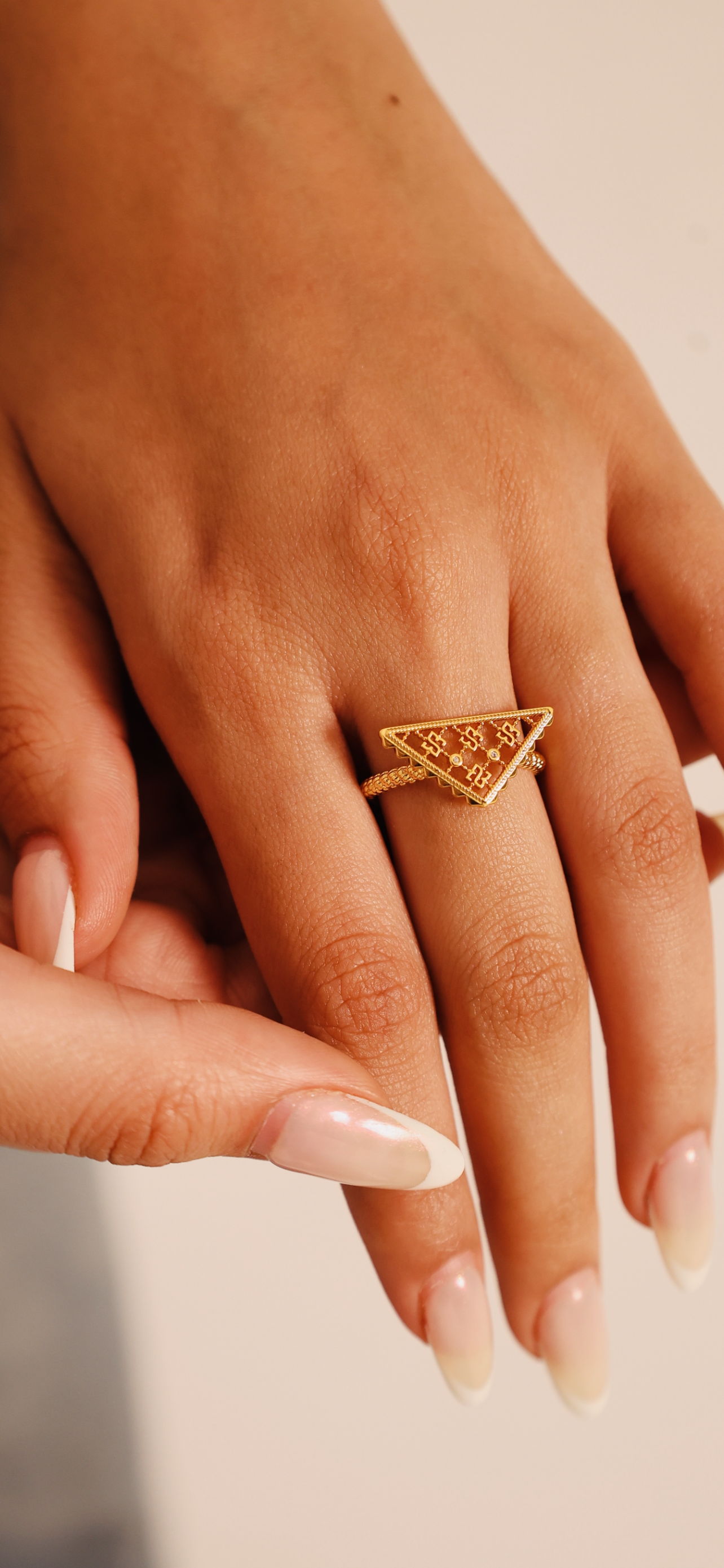 This ring follows the same triangle shape as in the necklaces and earrings to give you the ultimate matching set.