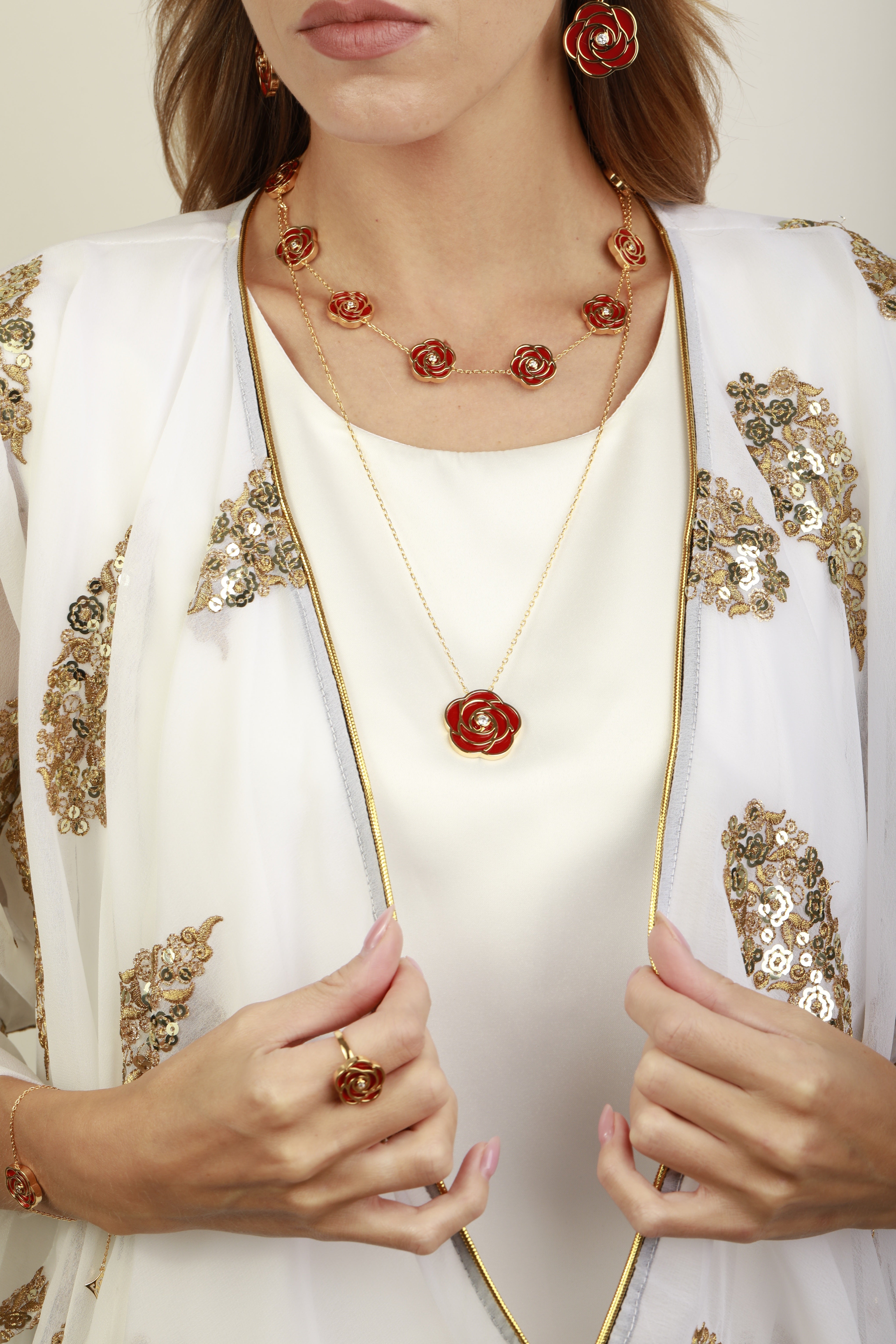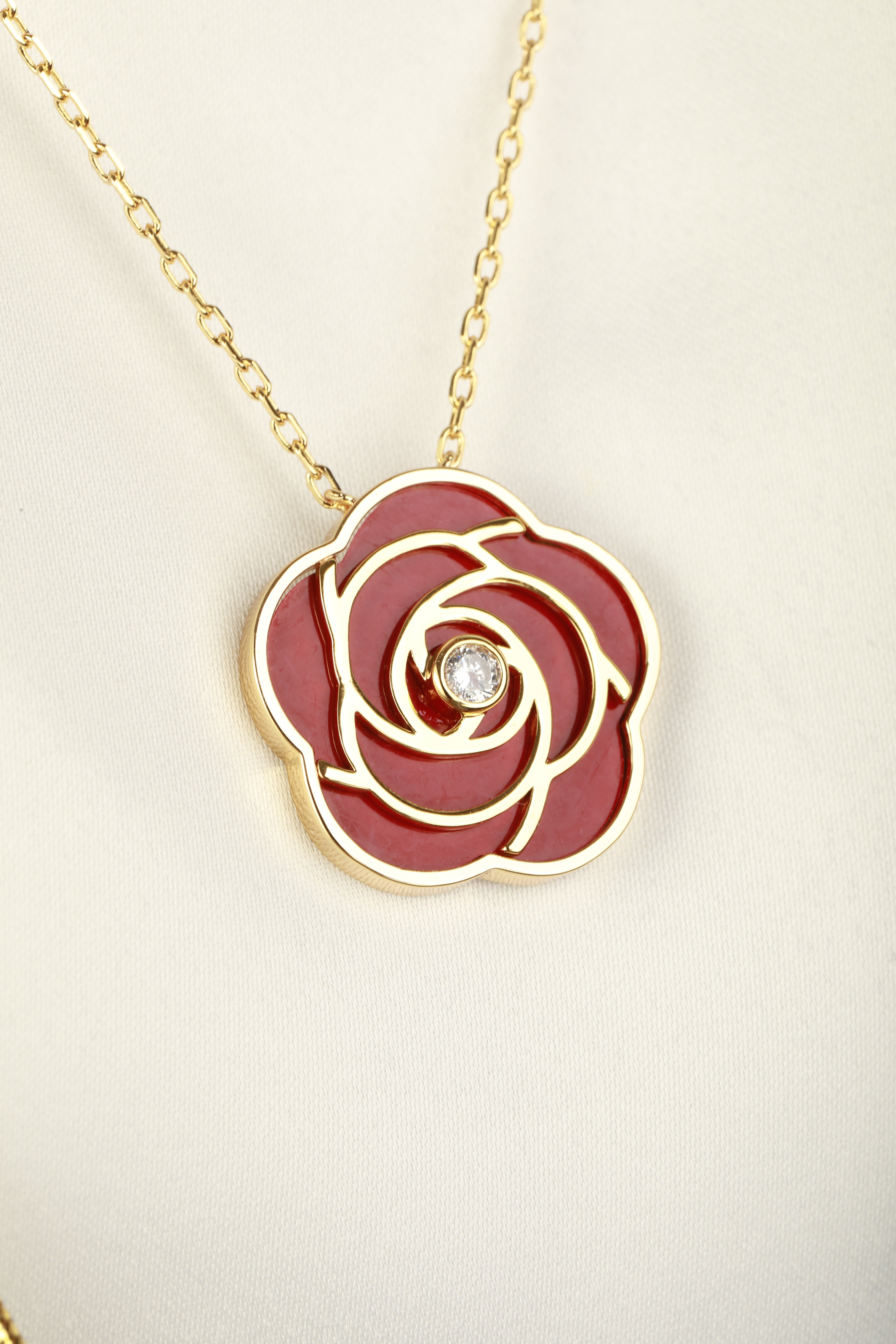 Symbolizing grace and sophistication, the long Necklace from our "Rose" Collection, designed to enhance your style and elevate your mood. This exquisite piece features a delicately crafted rose in a gold-plated frame, paired with an iridescent red agate stone.  Perfectly fitting around your neckline, it complements both formal and casual looks, making it a versatile addition to your jewelry collection. Embrace this symbol of timeless elegance and feel empowered with its unique beauty.