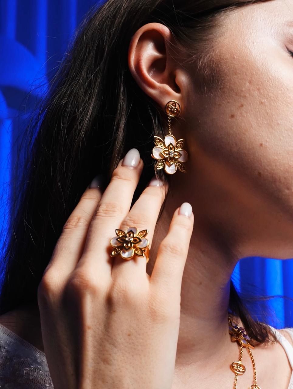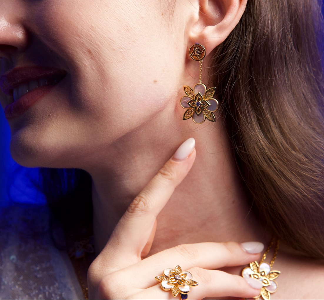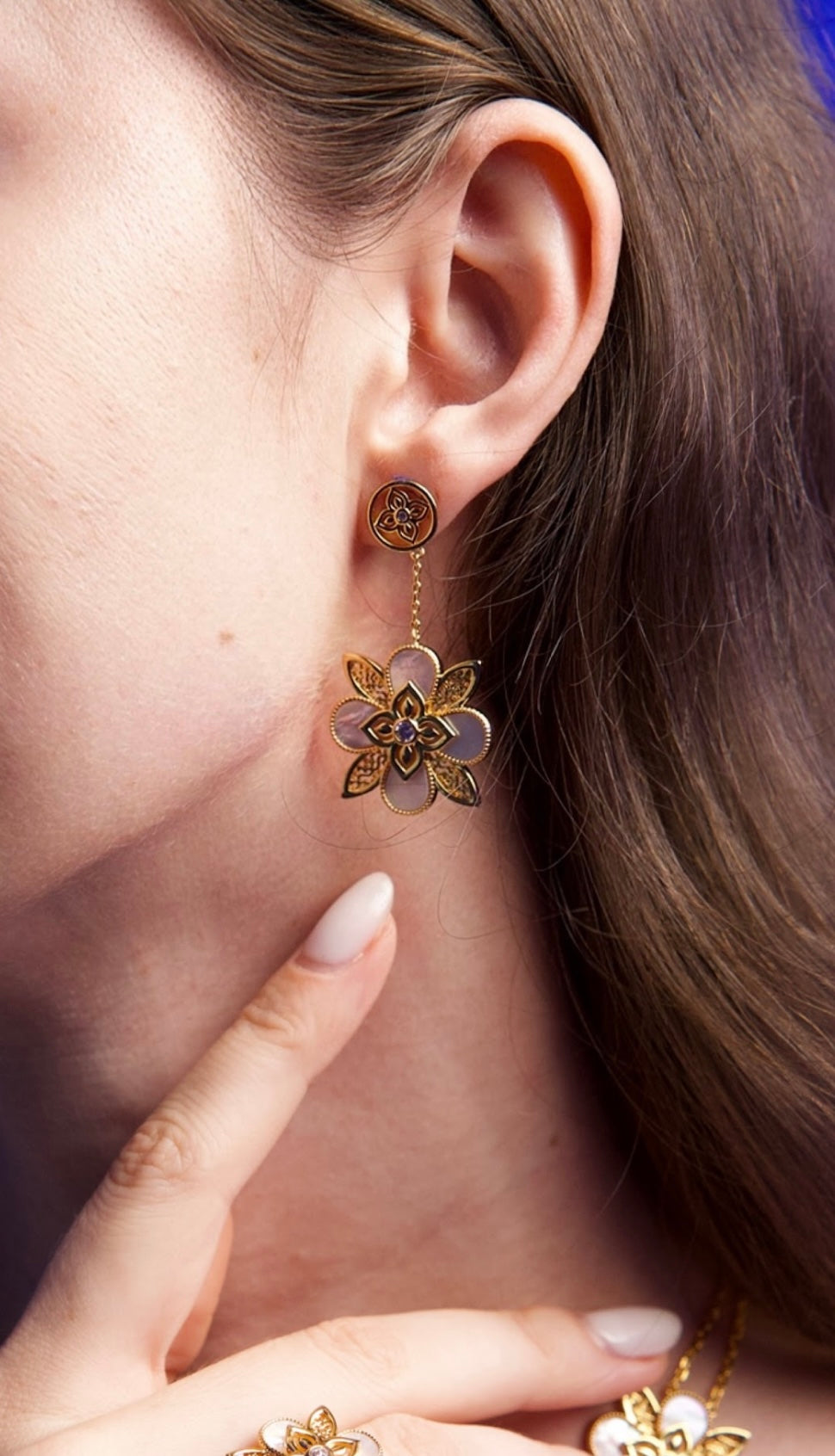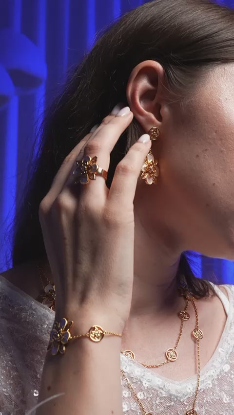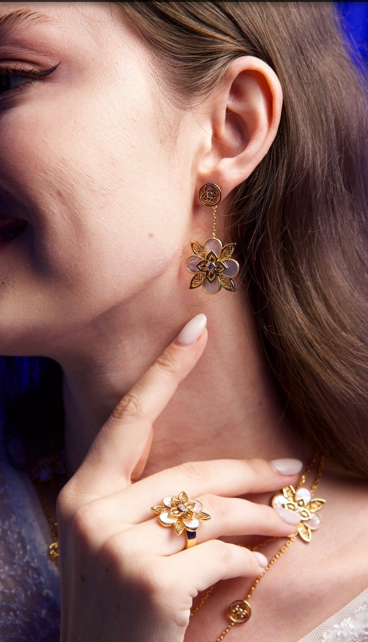Elegant and eye-catching, the Zahra Earrings feature a delicate floral drop design crafted in gold plating. Each petal is finished with white enamel and sparkling crystals, creating a graceful movement that frames the face beautifully. Perfect for adding sophistication to both casual and formal looks.